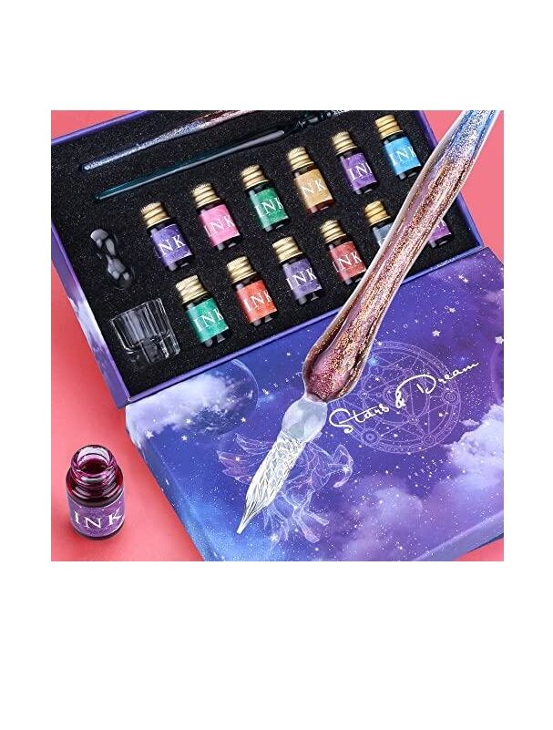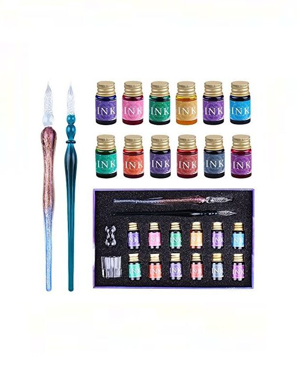 MÜKEMMEL HEDİYE SETİ - Sadece sanat kalemleri iyi tasarlanmış değil, aynı zamanda bu cam kalem ve mürekkep setinin paketi de özenle tasarlandı, bu da onu çocuklar için mükemmel bir hediye haline getiriyor. Bu kalem seti 2 adet cam dip kalem, 12 adet renkli mürekkep, bir adet temizleme kabı ve bir adet tutucudan oluşmaktadır.
