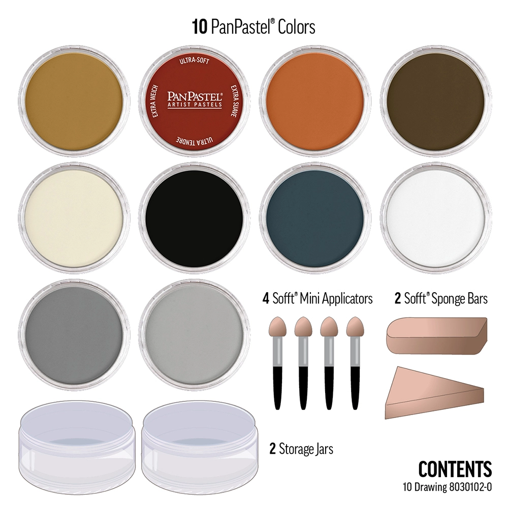 Çizim renkleri seçimi (siyah, beyaz, gri ve toprak renkleri dahil). Tüm renkler karıştırılarak ara renkler oluşturulabilir. Set, 10 adet PanPastel rengi ve çeşitli Sofft araçları içerir.